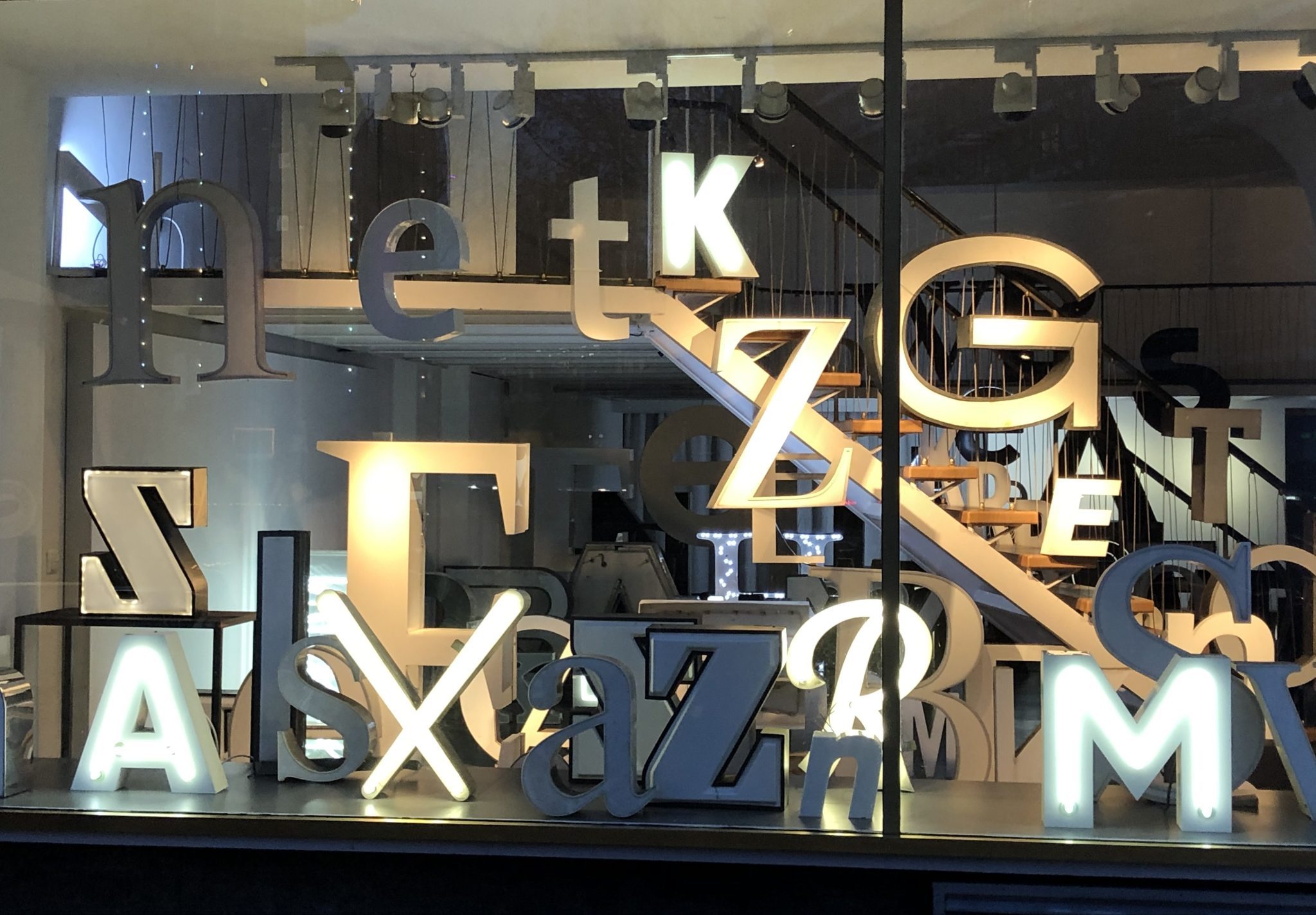 Parallel zur Instagram Challenge „MyABC“ zeigen wir im Temporary Bauhaus-Archiv eine Buchstaben-Installation, die durch das Schaufenster zu besichtigen ist. Die über 100 Lettern stammen aus Schriftzügen, die einst in verschiedenen Städten leuchteten und vom Buchstabenmuseum Berlin bewahrt wurden. Massiv oder zart, von kniehoch bis menschengroß, beleuchtet mit Neon oder LED, ergeben sie eine poetische Schau urbaner Typografie aus über sechs Jahrzehnten, gehalten in schwarz-grau-weiß. Vertreten sind z.B. kleine Zetts und Esse von einem Wiener Optikergeschäft, große weiße Es vom Tagesspiegel an der Potsdamer Straße in Berlin, wuchtige Bs von der Deutschen Bahn, ein elegantes B und Zett von Mercedes Benz oder ein Neon-M vom Berliner Kaffeemitte.