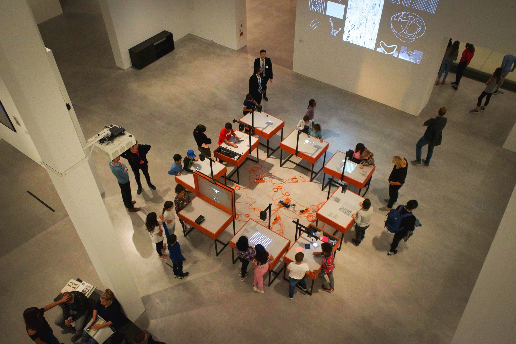 Besucher*innen können zum Beispiel digitale Fotogramme oder Materialcollagen erstellen, Lichtspuren mit ihrem Körper zeichnen, ihr Augenmaß schulen oder eigene Tierzeichnungen mittels Künstlicher Intelligenz analysieren lassen. Auf Wunsch werden die Ergebnisse gespeichert und Teil einer großen Collage, die auf die Wand projiziert wird.