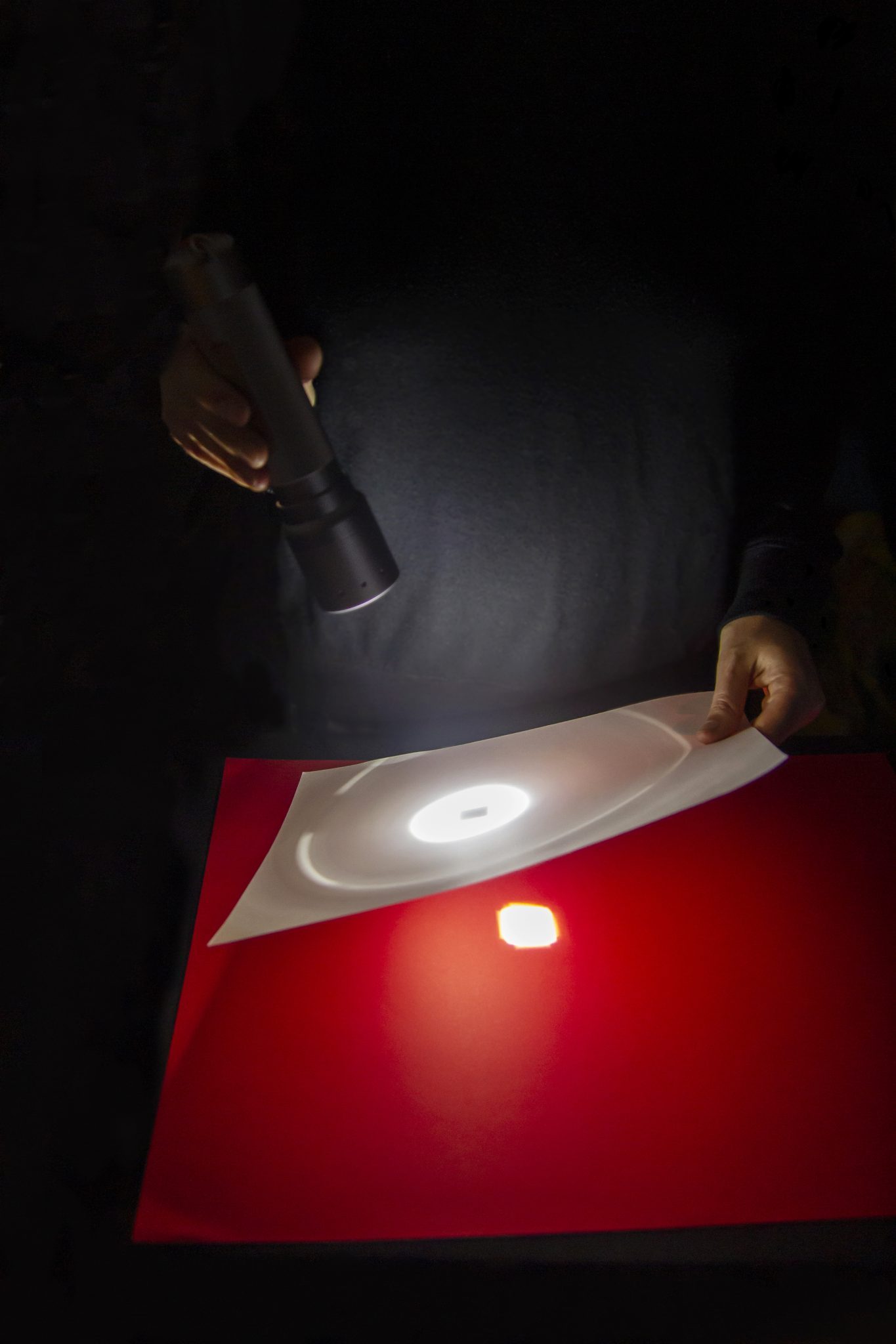2. Dein*e Fotoassistent*in hält das weiße Papier über den farbigen Karton und leuchtet mit der Taschenlampe hindurch. Auf dem Karton erscheint eine leuchtende, geometrische Form.